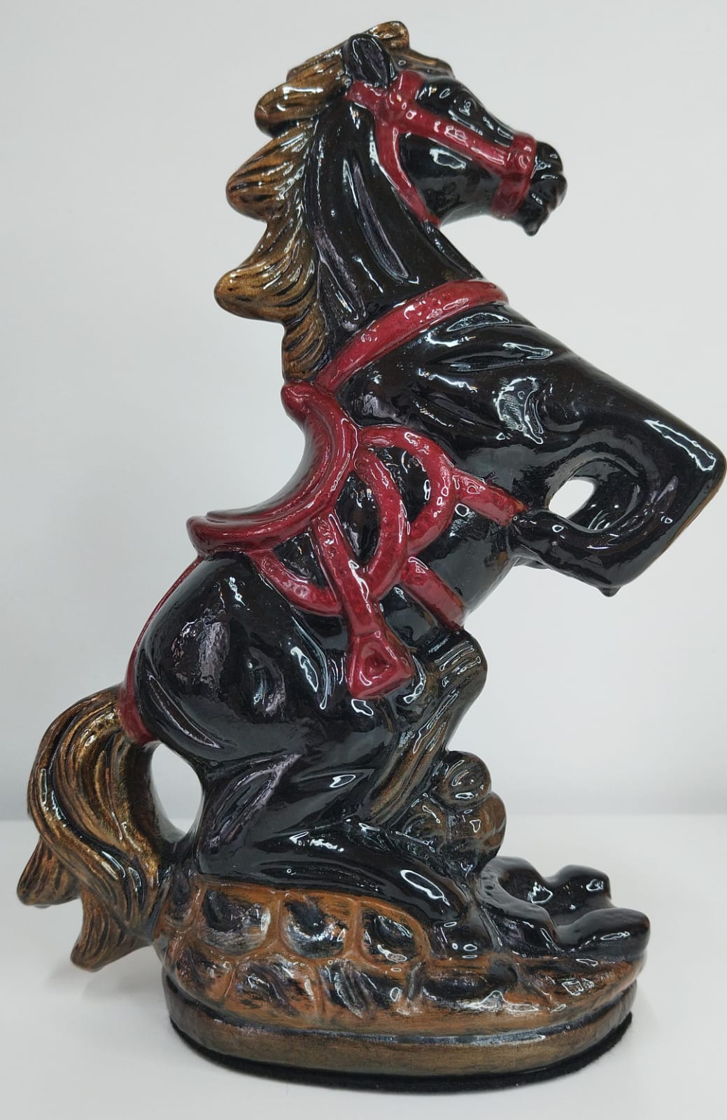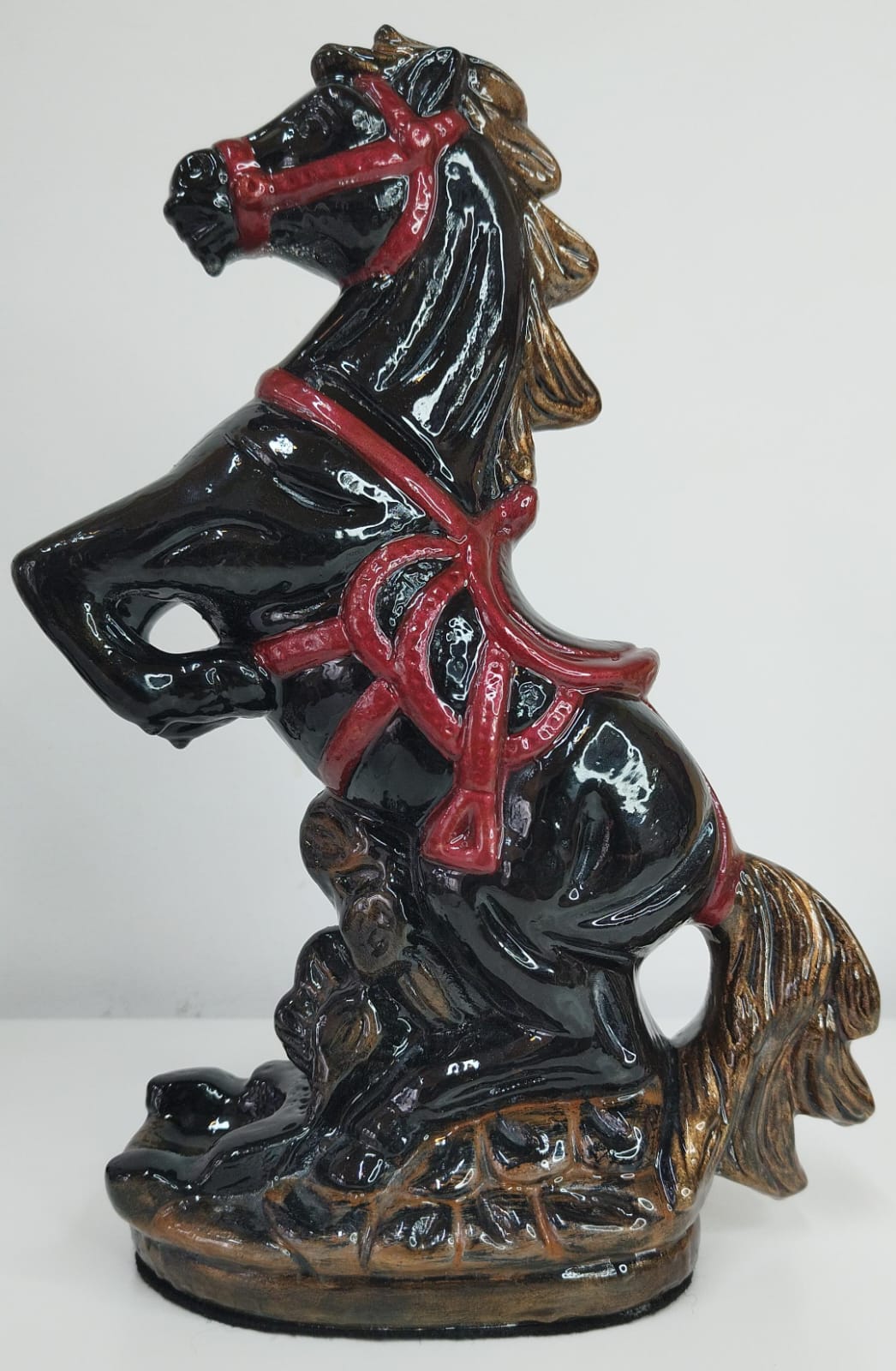 "Su imponente postura erguida simboliza fuerza, liderazgo y determinación, mientras que el acabado negro brillante, contrastado con detalles en tonos rojizos y base en efecto piedra, le otorga una presencia majestuosa y dominante. Esta pieza es ideal como elemento protagonista en espacios elegantes, aportando personalidad y un aire de distinción clásica que no pasa desapercibido."